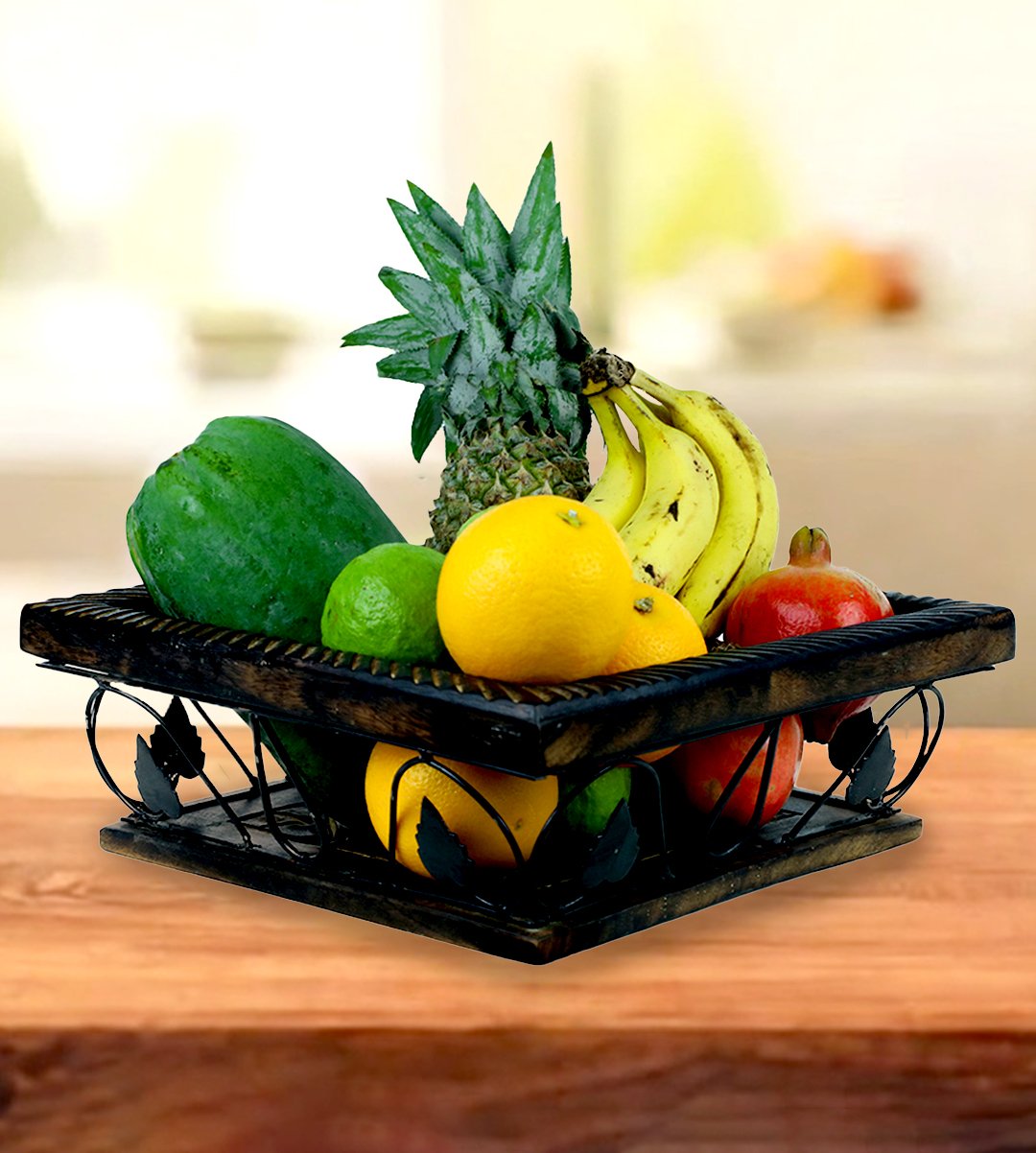 Wooden and wrought iron fruit and vegetable basket/ fruit vessel/ or a fruit container is used to keep both fruits and vegetables in it. The product is made up from wrought iron and wood. The designs enhancing the product into a classified one. It has best finishing. Those who love fruits will ofcourse buy it. You must have your favourite one. We have brought you many fruit and vegetable containers to choose from. You can gift it to your family, relatives, friends, siblings. Also it can be gifted in birthdays, marriages, anniversaries, house warming parties ,chirstmas parties, kitty parties etc. Grab it as soon as possible.