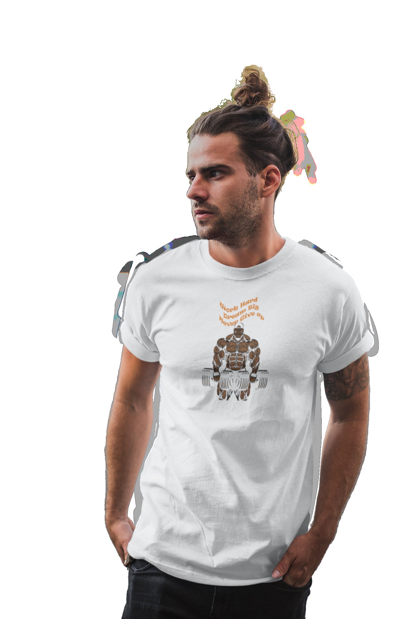 Work Hard, Dream Big, Never Give Up (BG Brown Bodybuilder) Round Neck Gym Tshirt (White Tshirt) - Clothes for Gym Lovers - Suitable for Gym Going Person - Foremost Gifting Material for Your Friends and Close Ones