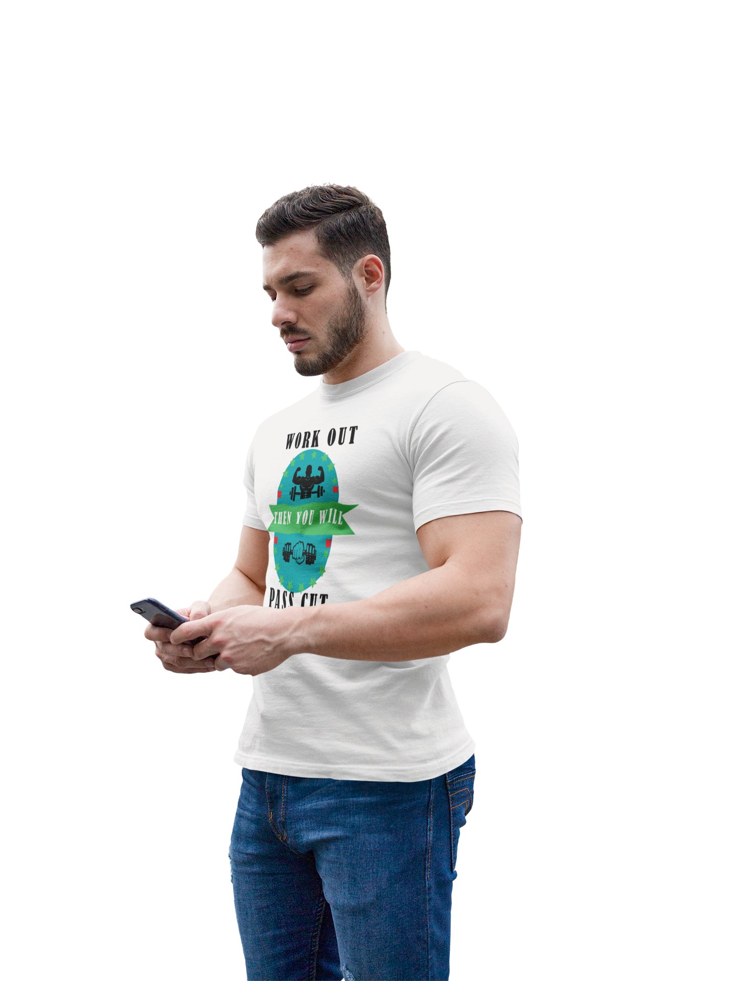Work Out Then You Will Pass Cut, Round Neck Gym Tshirt (White Tshirt) - Clothes for Gym Lovers - Suitable for Gym Going Person - Foremost Gifting Material for Your Friends and Close Ones