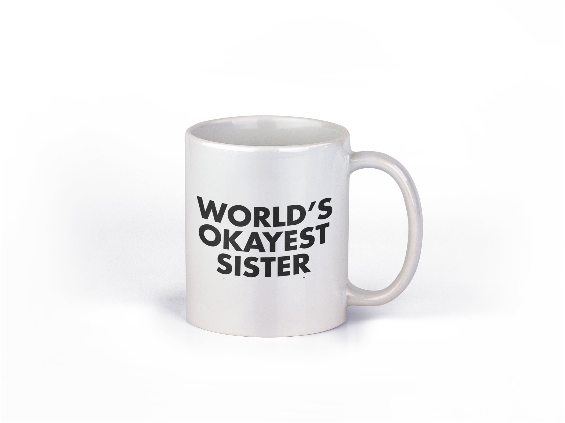 World's okayest sister Black text- family themed printed ceramic white coffee and tea mugs/ cups