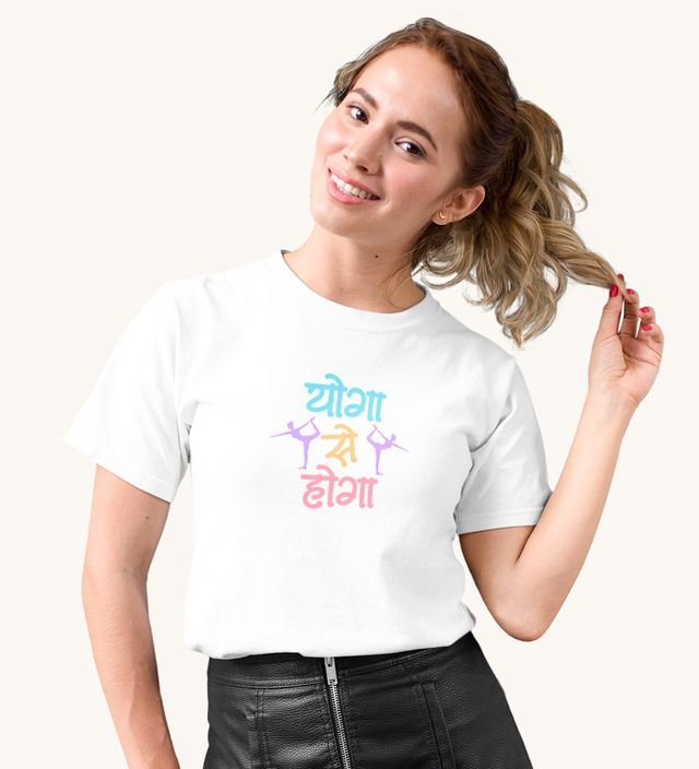 Yoga Se Hoga! White Round Neck Cotton Half Sleeved Women T-Shirt with Printed Graphics