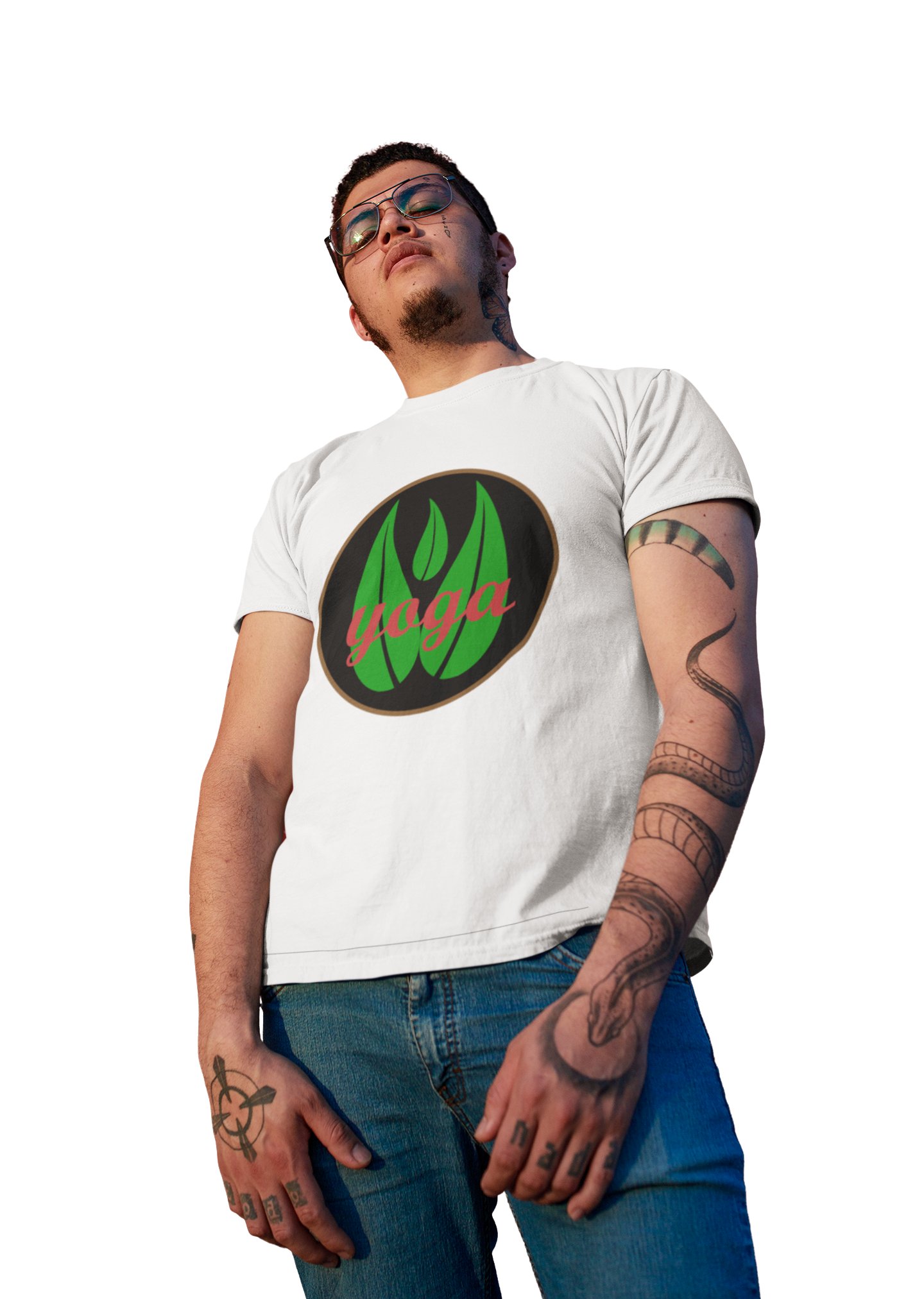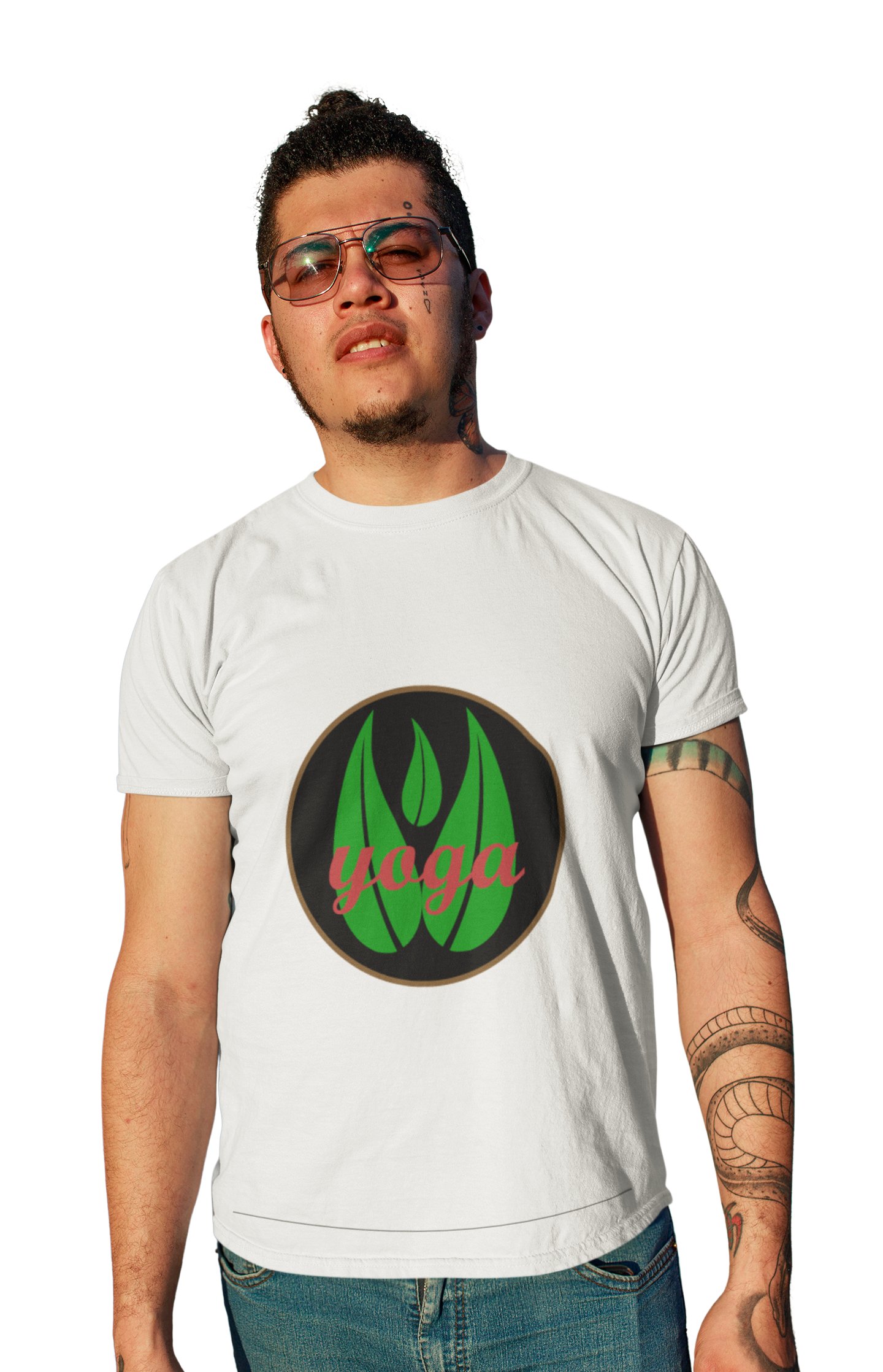 Yoga Text Written Over 3 Leaves, ( BG Green), Round Neck Tshirt - Clothes for Yoga Lovers - Suitable For Regular Yoga Going People - Foremost Gifting Material for Your Friends and Close Ones